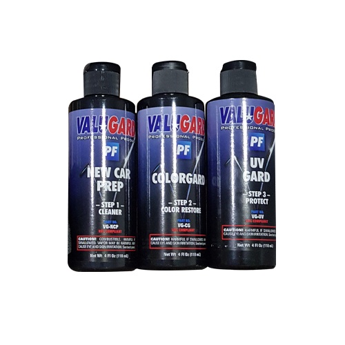 A four product kit that allows for virtually permanent repairs of black and gray trim items that have been damaged by aging, exposure to solvents, splatter from sealant wax or polish, and paint over spray. Packaged in a convenient vinyl carry case.
